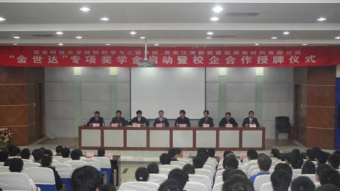 2010年3月30日下午,WilliamHill中文官方网站、西安江河新型建筑装饰材料有限公司“金世达”专项奖学金启动暨校企合作授牌仪式在临潼校区图书馆二楼报告厅举行。校党委副书记张立杰、西安江河新型建筑装饰材料有限公司董事长唐长江、学工部、校团委、教务处、材料学院负责人、部分教师和学生代表、企业代表及多家媒体参加了授牌仪式。