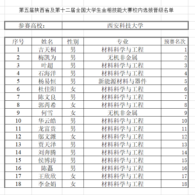 第五届陕西省及第十二届全国大学生金相技能大赛校内选拔比赛圆满结束,经老师评议,学院审核,评定以下同学成功晋级,现予以公式: