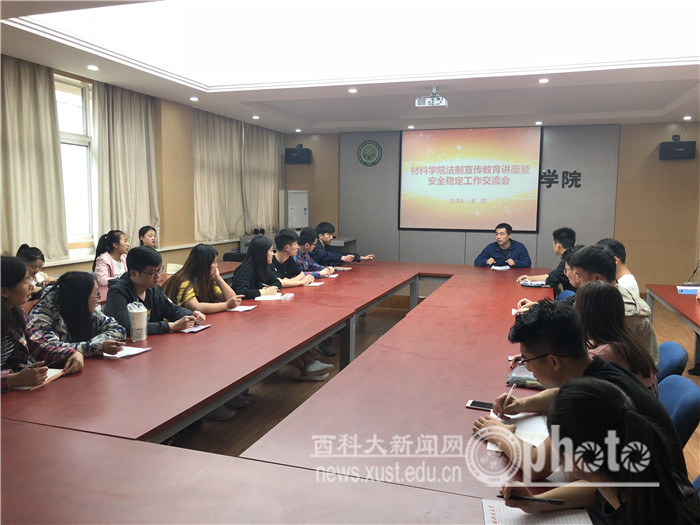 4月28日,材料学院在临潼校区骊山校园举办大学生法制安全宣传教育交流会。活动邀请了保卫处治安科科长王超进行了宣讲,学院全体辅导员、各年级学生干部参加了活动。