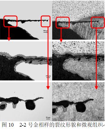 (2)引导学生根据金相显微结果分析得出结论:宏观裂纹产生是由于高温负载集中区域产生的微裂纹经过扩展发展而成。但是微裂纹在这些区域产生的原因仍不清楚,根据前面提出的思路,还需要通过SEM进一步对裂纹形态、断口形态进一步观察,得到结论。下图为SEM测试结果。