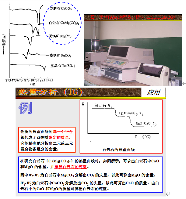 白云石主要化学成分为白云石化学成分为CaMg(CO3)2,是组成白云岩和白云质灰岩的主要矿物成分。白云石可用于建材、陶瓷、玻璃和耐火材料、化工以及农业、环保、节能等领域。主要用作碱性耐火材料和高炉炼铁的熔剂,生产钙镁磷肥和制取硫酸镁,以及生产玻璃和陶瓷的配料。做为金属镁和轻质碳酸钙的主要原料,白云石中CaMg(CO3)2的含量尤为关键。但CaMg(CO3)2与CaCO3和MgCO3的物相结构和成分组成接近,采用化学分析和物相检测的手段精确标定其纯度难度较大,但三者的热分解温度和失重差别较大,故采用热分析手段进行纯度检测是一种最佳方案。