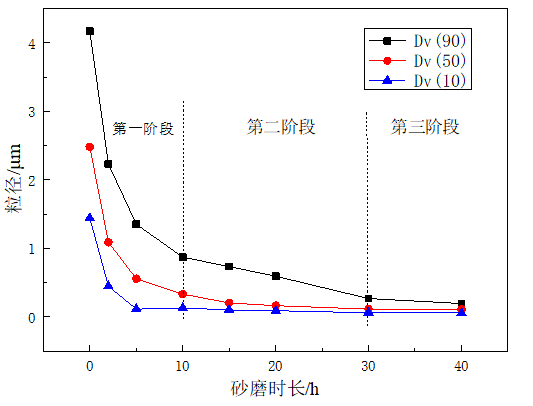 根据不同研磨时长取样所得的激光粒度测试结果,可以发现在保持工艺参数不变的情况下,碳化硅的粒度特征参数Dv(10)、Dv(50)、Dv(90)在砂磨过程中均经历了一个从快速下降到缓慢下降直至基本不变的过程。