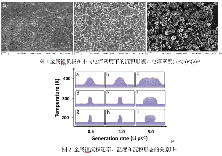 本案例以金属锂负极为研究对象,主要内容是系统分析金属锂在锂离子电池过程中的溶解/沉积过程,要求学生结合着两章内容,分析讨论金属锂应用的一系列问题,如SEI膜的形成和破裂,枝晶生长与粉化等问题,帮助学生消化巩固金属阳极过程和阴极过程这两章知识的能力,锻炼学生综合运用所学知识分析电池前沿问题的能力。本案例采用金属锂对称电池,电解液采用醚基电解液,讨论电流密度对于金属锂沉积形态的影响。主要结果如图1~2所示: