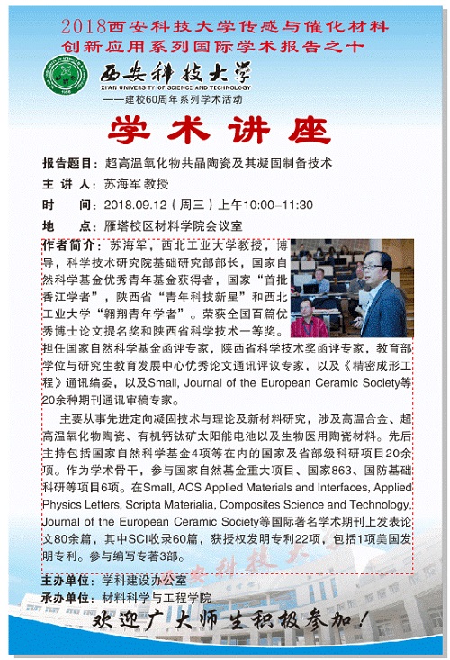 苏海军,西北工业大学教授,博导,科学技术研究院基础研究部部长,国家自然科学基金优秀青年基金获得者,国家“首批香江学者”,陕西省“青年科技新星”和西北工业大学“翱翔青年学者”。荣获全国百篇优秀博士论文提名奖和陕西省科学技术一等奖。担任国家自然科学基金函评专家,陕西省科学技术奖函评专家,教育部学位与研究生教育发展中心优秀论文通讯评议专家,以及《精密成形工程》通讯编委,以及Small, Journal of the European Ceramic Society等20余种期刊通讯审稿专家。