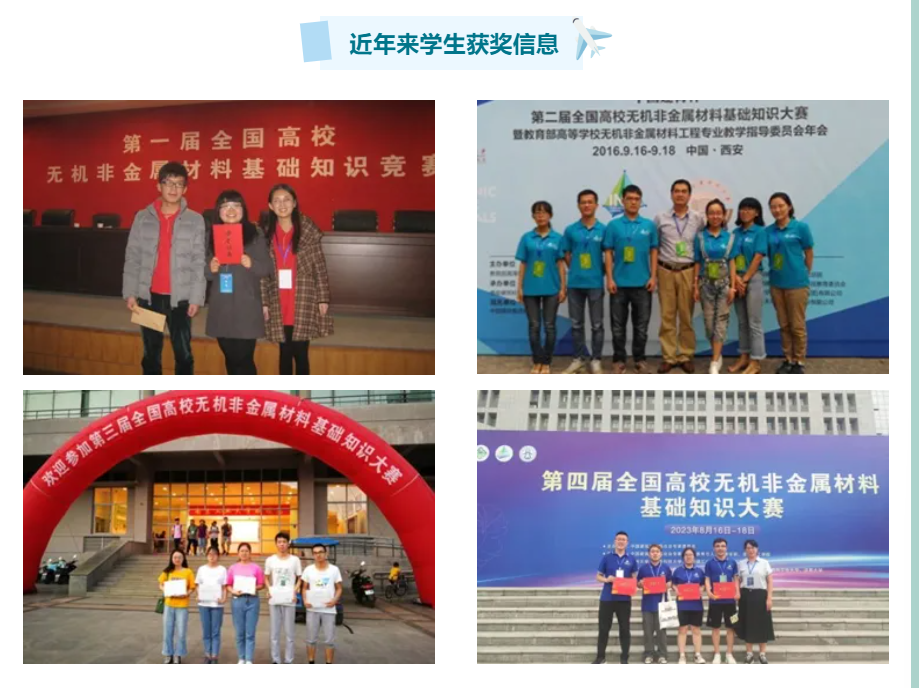 本专业重视对学生创新创业能力的培养。在专业老师指导下,本科生参加各级各类创新创业比赛的比例逐年增加,以学生为负责人参加的比赛包括全国无机非金属材料基础知识竞赛、全国复合材料大赛、全国大学生“互联网+”、“挑战杯”和“大学生创新创业”等获国家级奖项4项,省部级奖项32项;本科生参与发表核心级别以上的论文33篇。