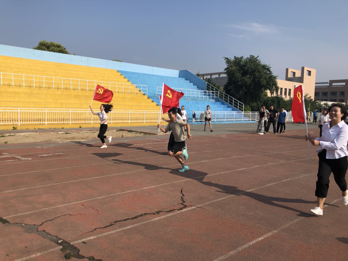 为庆祝中国共产党成立97周年,7月1日上午,材料学院学生党支部在临潼校区田径场举办第四届“精神传承、党旗接力”活动。在活动中,材料学院学生第一、第二党支部共64名党员分4个小组,党员们手持党旗在塑胶跑道上进行了100米接力传递赛跑。材料学院党员接力跑旨在传承“一个党员,一面旗帜,一个支部,一个堡垒”的精神,希望学生党员能够继承和发扬红色精神,传递新时代正能量,展现优良风采风貌,勤勉奋进,恪守纪律,争做一名合格的共产党员。
