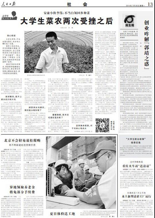 7月28日,《人民日报》社会版以《安康小伙李伟:不当白领回乡种菜》为题,对平利县长安镇李伟创业事迹进行了大幅报道,并配发了图片、言论,引起了社会的广泛关注。