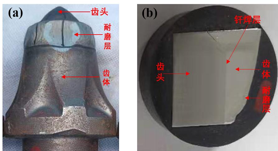 结合实物照片、说明截齿样品齿头、耐磨层、齿体的取样规则。