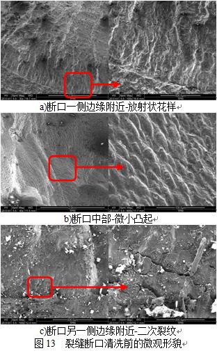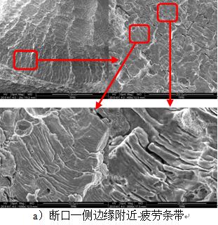 (2)引导学生根据金相显微结果分析得出结论:宏观裂纹产生是由于高温负载集中区域产生的微裂纹经过扩展发展而成。但是微裂纹在这些区域产生的原因仍不清楚,根据前面提出的思路,还需要通过SEM进一步对裂纹形态、断口形态进一步观察,得到结论。下图为SEM测试结果。