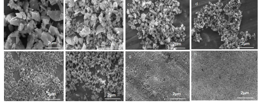 对比不同砂磨时长取样所得的扫描电镜测试照片,讲述中注意引导学生注意结果的规律性变化与工艺参数之间变化的关系。