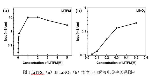 本案例选取LiTFSI(双三氟甲基磺酸亚胺锂)和LiNO3这两种在锂硫电池中常见的锂盐,研究其在DME(乙二醇二甲醚)/DOL(1, 3二氧戊环)(体积比为1:1)的混合有机溶液中锂盐浓度和离子电导率之间的关系。结果如图1所示: