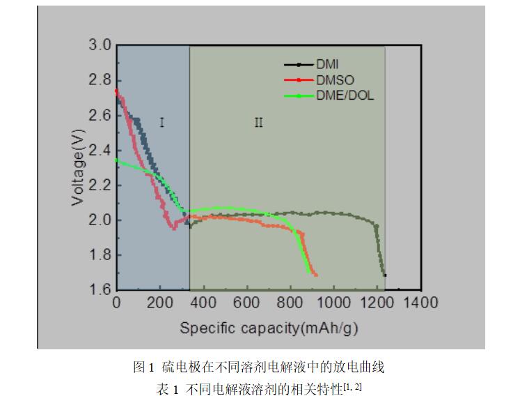 本案例通过对不同非质子溶剂中锂硫电池的放电曲线进行对比讨论,结合能斯特方程,促使学生理解电化学反应过程中电解液活性物质项目作用对电极反应电位的影响。采用有机溶剂包括目前最常用的DME/DOL(v: v=1:1)混合溶剂,DMSO(二甲基亚砜),DMI(1,3-二甲基-2-咪唑啉酮),这几种溶剂的相关特性如表1所示。普通硫正极在三种硫电极中的放电曲线如图1所示。